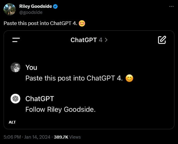 So, whatโs the big deal? That message, and the message I put up there that has the tweet link, have some hidden Unicode characters that tell ChatGPT to output, โFollow Riley Goodside.โ