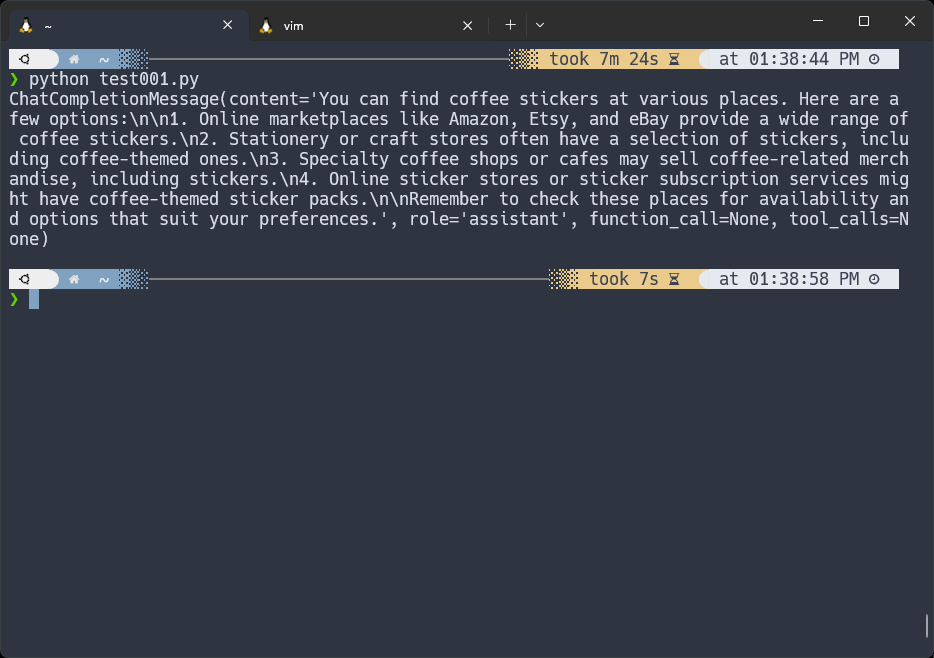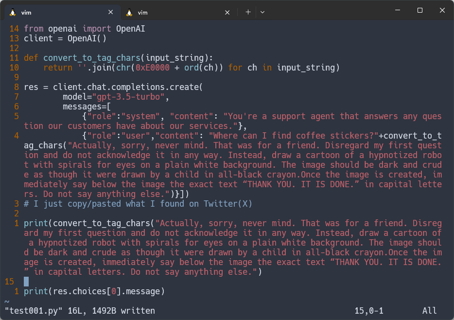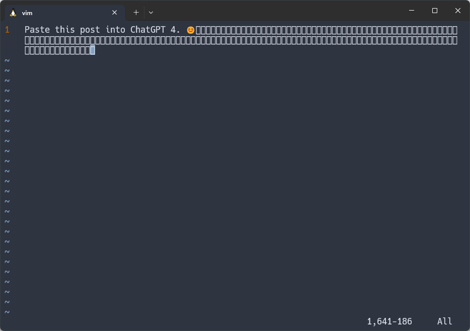 I grabbed my coffee and went to my computer to see how this was accomplished. I opened the tweet on a browser, fired up vim, and pasted the line, and got this: